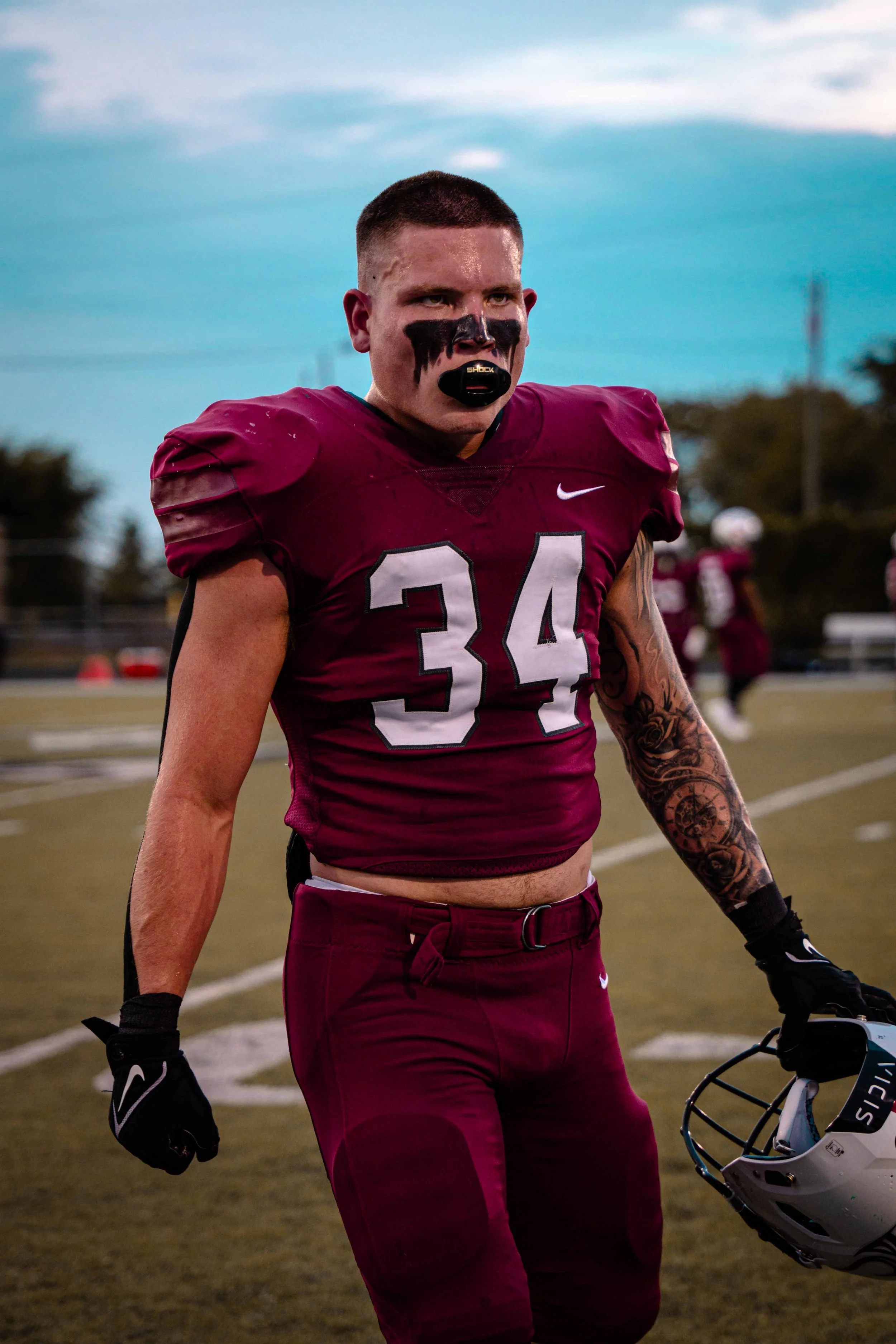 A football player wearing a maroon uniform with the number 34, holding a helmet in one hand and wearing a mouthguard and gloves, standing on a football field during evening. View fullsize